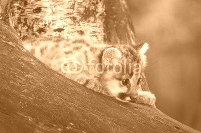 • Female Cougar Kitten (Puma concolor) Curious in Tree